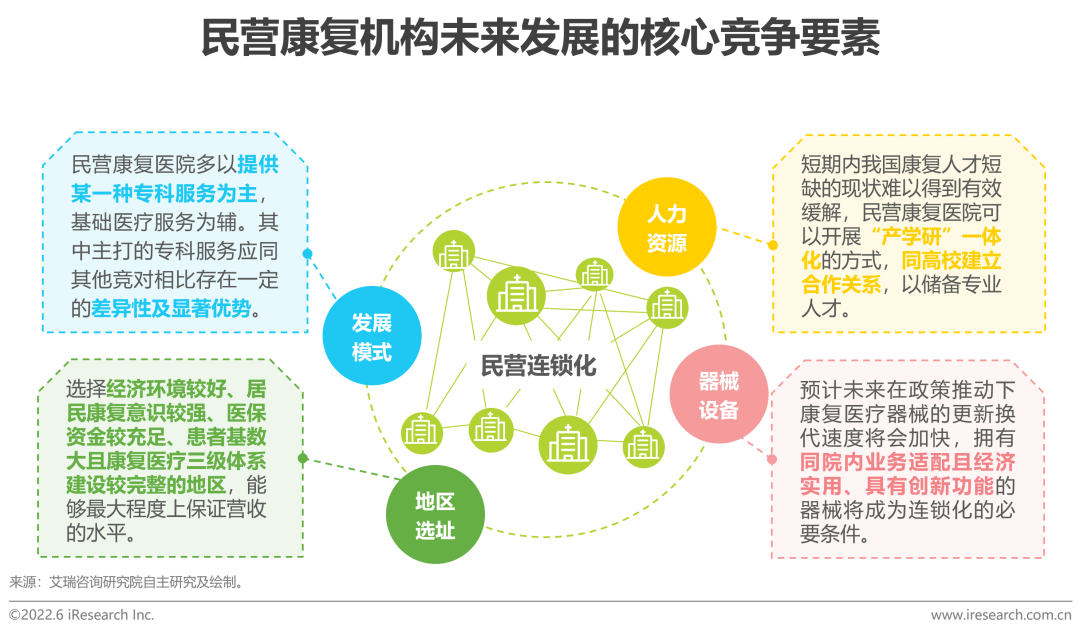 同時,相對于臨床醫(yī)療而言,康復(fù)醫(yī)療具備對人才、資金要求較低、盈利水平較高、引流成本較低等特點。種種因素使得民營康復(fù)機(jī)構(gòu)將借力資本投融及并購實現(xiàn)飛躍式的發(fā)展且逐步走向連鎖化,在這個過程中,發(fā)展模式、人力資源、地區(qū)選址和器械設(shè)備將成為核心四大競爭要素。