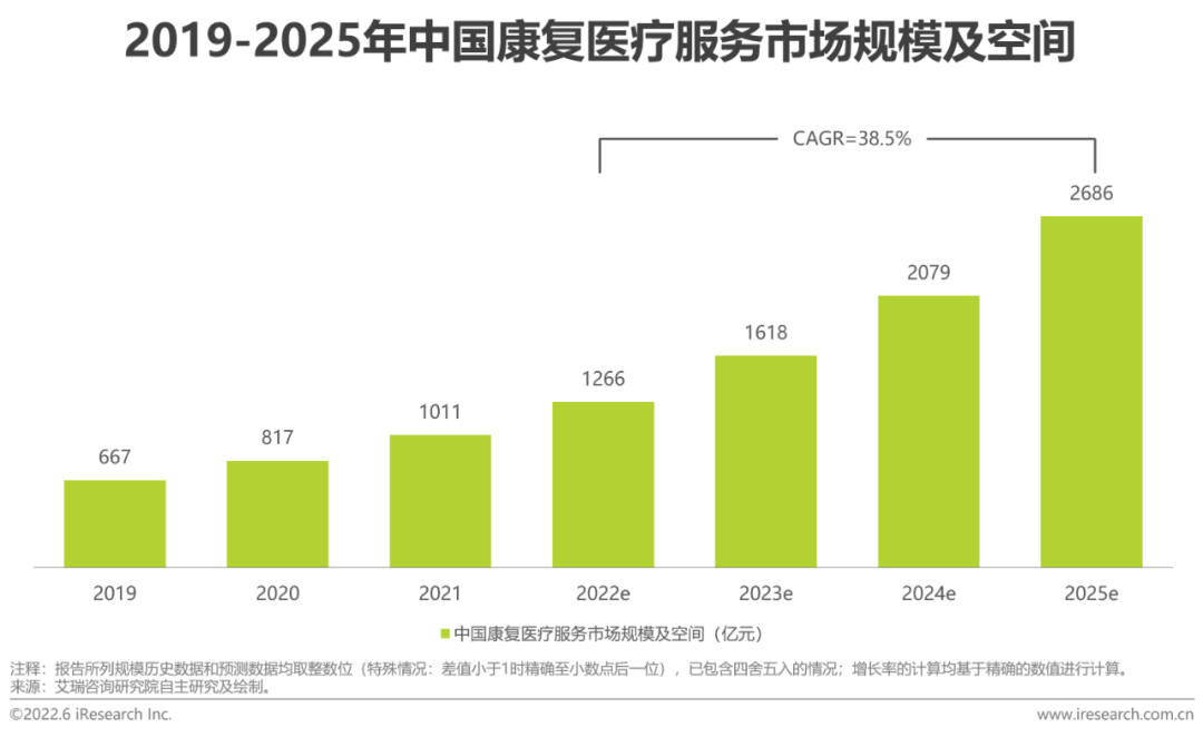 艾瑞研究發(fā)現(xiàn),2021年我國康復(fù)醫(yī)療服務(wù)行業(yè)市場規(guī)模約1011億元,未來在后疫情時代下,隨著人口老齡化的加速、國民康復(fù)意識的逐步覺醒以及國家政策的持續(xù)強(qiáng)力推動,康復(fù)醫(yī)療服務(wù)行業(yè)市場規(guī)模將持續(xù)增長,有望于2024年突破兩千億元,預(yù)計2025年中國康復(fù)醫(yī)療服務(wù)市場規(guī)模達(dá)2686億元,2022年至2025年CAGR約為38.5%,整體市場未來成長空間廣闊。