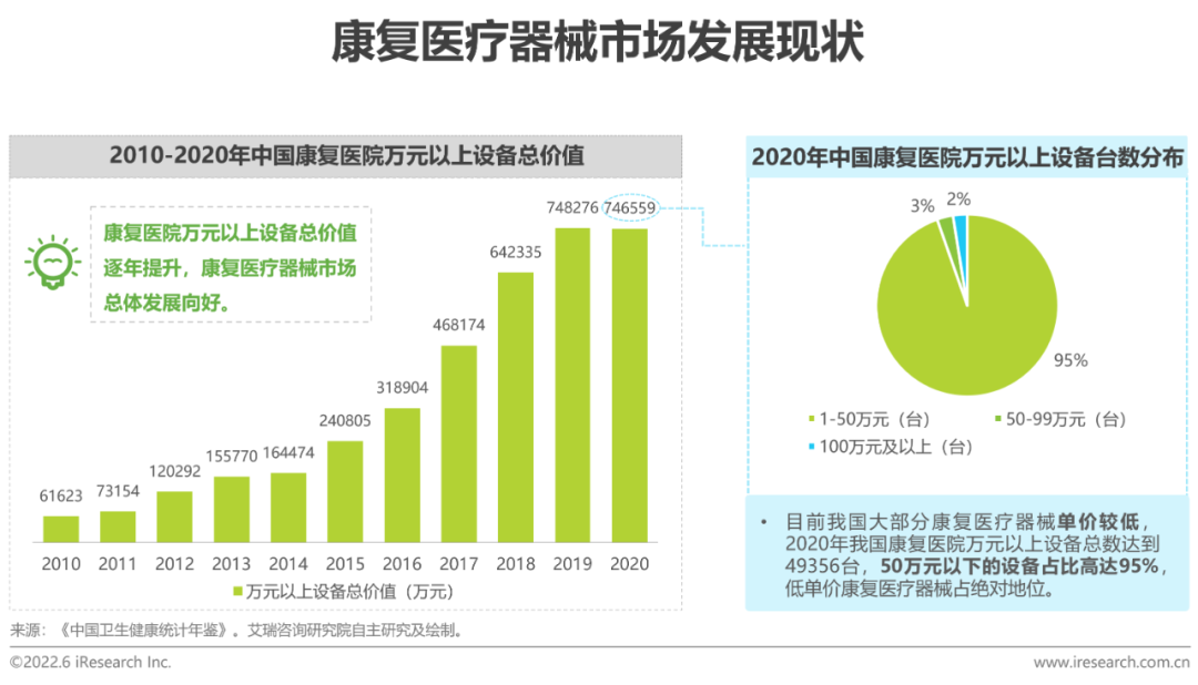 康復(fù)醫(yī)療器械是康復(fù)治療開展的前提與基礎(chǔ)。近年來,在市場需求和國家政策推動下,康復(fù)醫(yī)療器械行業(yè)處于快速成長期。就我國而言,康復(fù)醫(yī)院內(nèi)萬元以上的康復(fù)設(shè)備總價值呈現(xiàn)逐年增長趨勢,但目前國內(nèi)的康復(fù)器械仍以仿制國外為主,存在一定程度的產(chǎn)品同質(zhì)化,大部分康復(fù)醫(yī)療器械單價不高,高端器械占比較小。隨著康復(fù)??漆t(yī)院與康復(fù)服務(wù)機(jī)構(gòu)的發(fā)展,以及政府持續(xù)鼓勵研發(fā)創(chuàng)新,艾瑞認(rèn)為,未來高效能、高技術(shù)、高品質(zhì)的高端康復(fù)器械會逐步滿足人民群眾的健康需求,高端康復(fù)醫(yī)療器械未來可期。