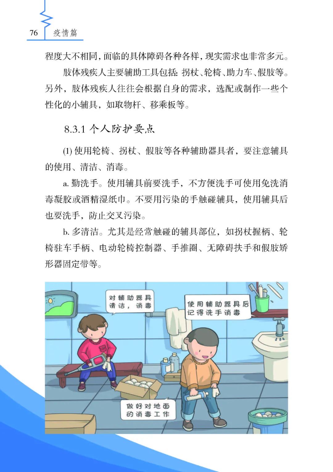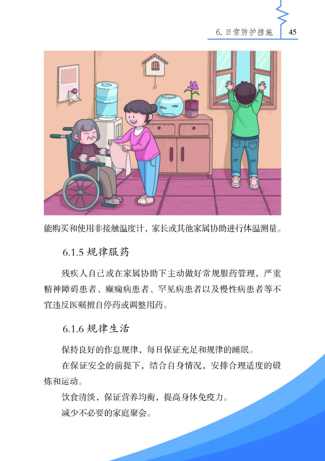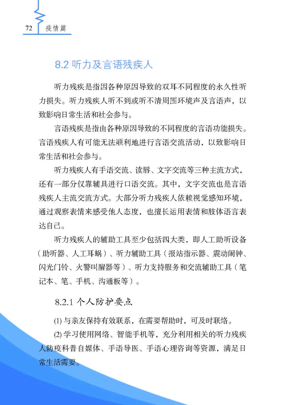 疫情給殘疾人帶來了身心健康、照護、經(jīng)濟等多方面的挑戰(zhàn),日常生活中,殘疾人應(yīng)如何做好防護呢?為做好殘疾人群體疫情防控工作,幫助殘疾人朋友科學(xué)防疫,當(dāng)好自己健康的第一責(zé)任人,中國殘疾人聯(lián)合會組織編寫了《殘疾人安全防護實用手冊·疫情篇》。
