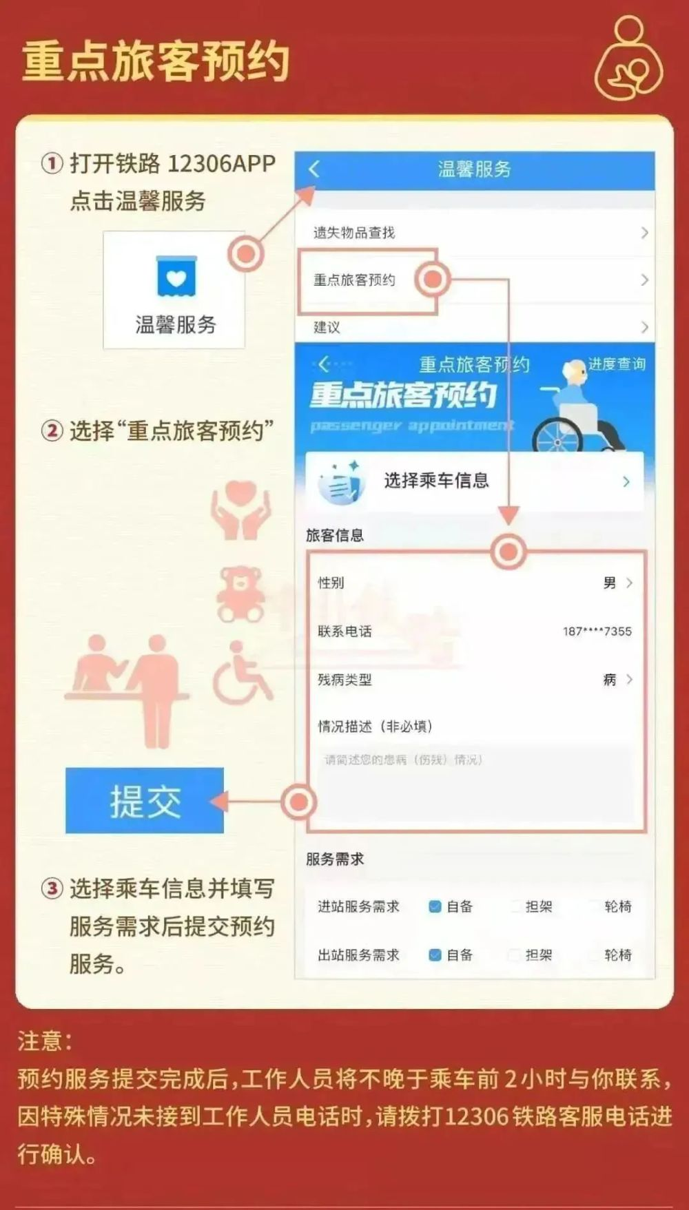 重點(diǎn)旅客預(yù)約服務(wù)僅受理依靠輪椅、擔(dān)架等輔助器具旅行的老年、傷病、殘疾等已購(gòu)車票旅客服務(wù)需求。
