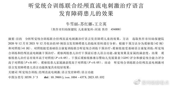 牛雪麗,蘇紅娜,王立英.聽覺統(tǒng)合訓(xùn)練聯(lián)合經(jīng)顱直流電刺激治療語言發(fā)育障礙患兒的效果[J].河南醫(yī)學(xué)研究,2023,32(03):513-516.