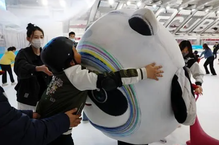4月2日,北京,“星星的孩子”與冰墩墩人偶互動。當(dāng)天是第16個世界孤獨癥日。國家游泳中心(水立方/冰立方)第十三次為“星星的孩子”點亮藍燈。中新社記者 韓海丹/攝