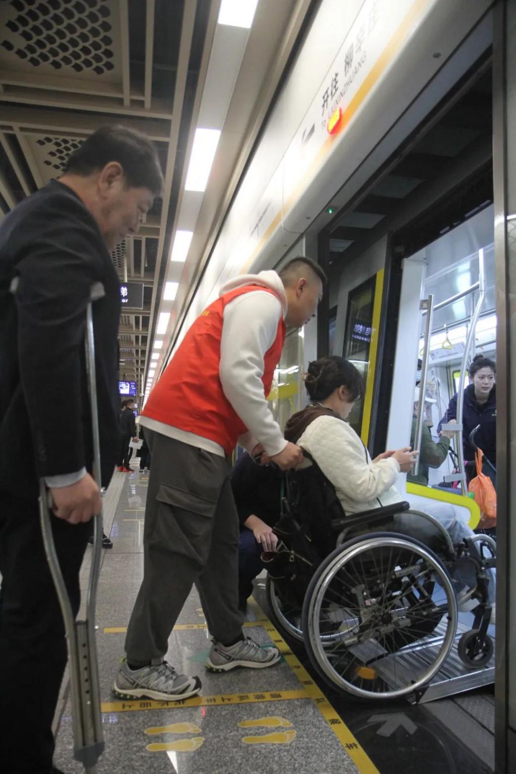 在 2 號線裕華路站,殘疾人朋友在地鐵工作人員及志愿者的引導下通過輪椅坡道乘坐無障礙垂梯進入車站,車站工作人員為殘疾人朋友詳細講解了票務政策,以及乘車的一系列便利服務,介紹了車站各類無障礙設備設施使用方法。