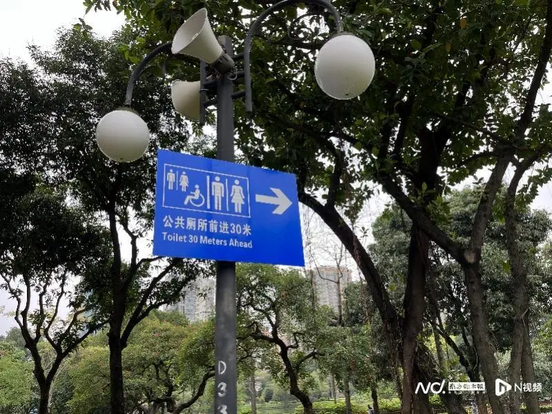 曉港公園園路上立有指向清晰的無(wú)障礙衛(wèi)生間指示牌。