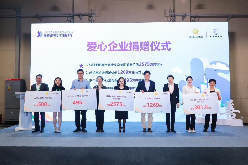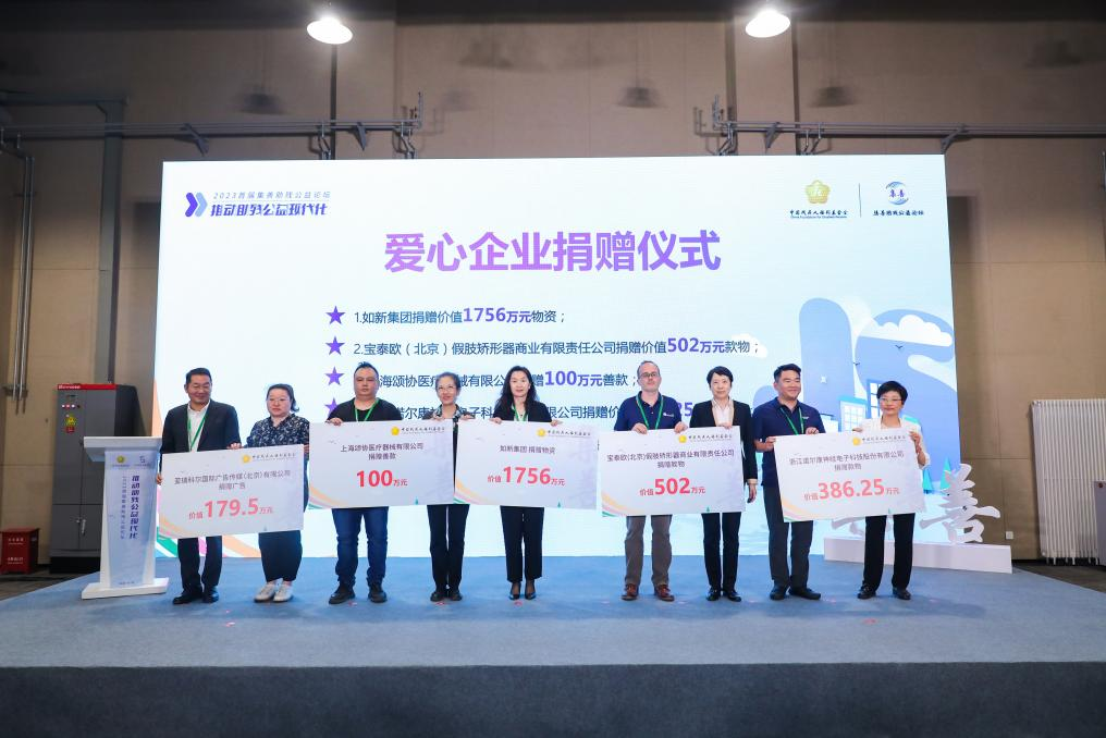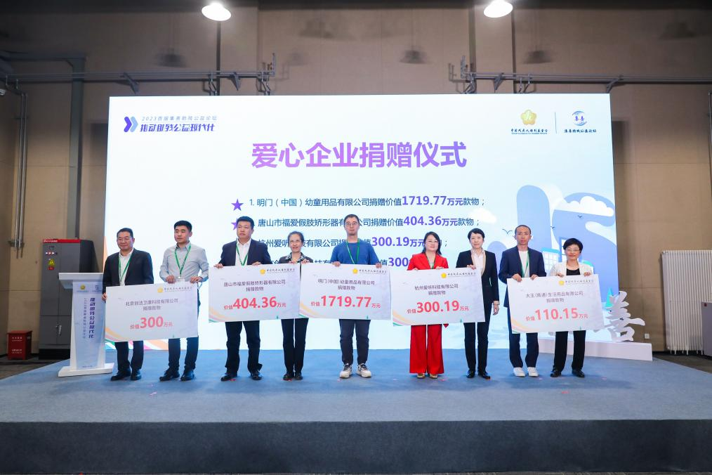 (上三圖為可孚醫(yī)療科技股份有限公司、新矩基金會、深圳美麗魔方健康投資集團(tuán)、浙江螞蟻公益基金會、正保遠(yuǎn)程教育、寶泰歐(北京)假肢矯形器商業(yè)有限責(zé)任公司、上海頌協(xié)醫(yī)療器械有限公司、如新集團(tuán)、浙江諾爾康神經(jīng)電子科技股份有限公司、亞瑞科爾國際廣告?zhèn)髅剑ū本┯邢薰?、大王(南通)生活用品有限公司、杭州愛聽科技有限公司、明門(中國)幼童用品有限公司、唐山市福愛假肢矯形器有限公司、北京創(chuàng)潔衛(wèi)康科技有限公司等15家愛心企業(yè)和機(jī)構(gòu)向中國殘疾人福利基金會捐贈了總價值1.07億元的款物)