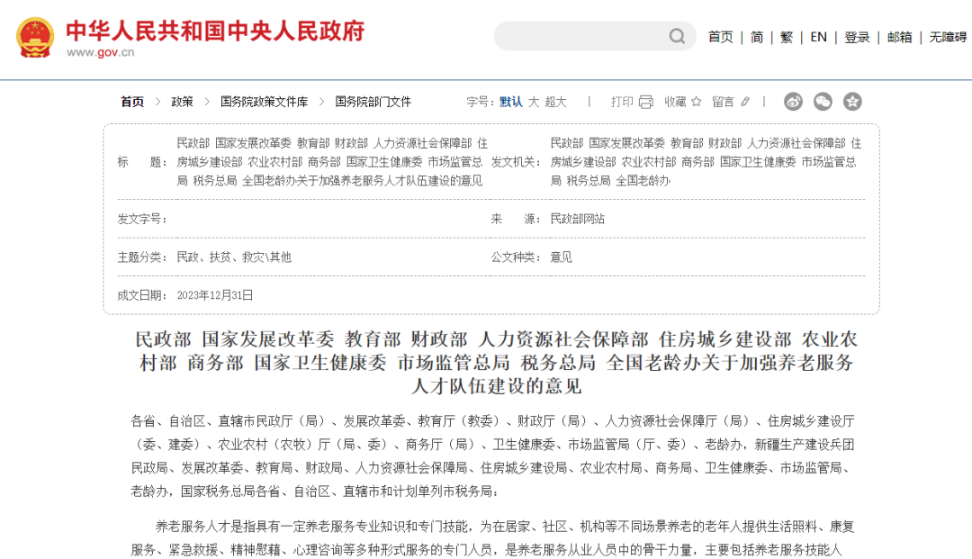 近日,民政部等12個(gè)部門(mén)制定出臺(tái)《關(guān)于加強(qiáng)養(yǎng)老服務(wù)人才隊(duì)伍建設(shè)的意見(jiàn)》(以下簡(jiǎn)稱“意見(jiàn)”),這是我國(guó)首個(gè)關(guān)于養(yǎng)老服務(wù)人才隊(duì)伍建設(shè)的綜合性政策文件。