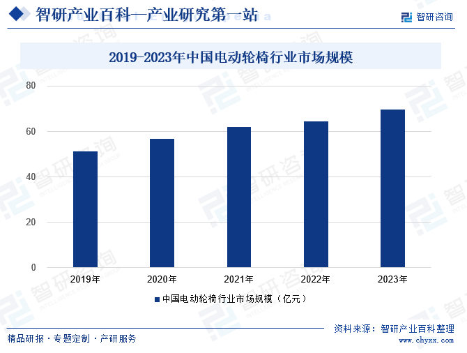 隨著全球人口老齡化的不斷加劇以及殘疾人口數(shù)量的穩(wěn)步增長,電動輪椅車的需求正呈現(xiàn)出顯著的增長趨勢。面對行動不便的困境,越來越多的老年人開始依賴電動輪椅作為他們?nèi)粘I钪械闹匾焦ぞ?,而殘疾人群體更是迫切需要電動輪椅來滿足他們的出行需求。2023年中國電動輪椅行業(yè)市場規(guī)模為69.72億元,同比增長8.13%。隨著國內(nèi)老齡化問題的日益凸顯,預(yù)計對電動輪椅車的需求將持續(xù)增加,從而推動整個行業(yè)市場規(guī)模的進一步上漲。