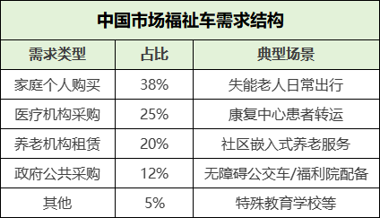 雖然普及度低,但實(shí)際上殘疾人和老年人對(duì)福祉車的需求相當(dāng)強(qiáng)烈。目前家庭個(gè)人購(gòu)買福祉車的需求占比38%,其次是醫(yī)療機(jī)構(gòu)采購(gòu)、養(yǎng)老機(jī)構(gòu)租賃等。