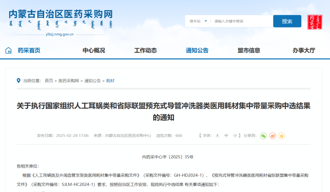 2月28日,內(nèi)蒙自治區(qū)醫(yī)藥采購中心發(fā)布《關(guān)于執(zhí)行國家組織人工耳蝸類和省際聯(lián)盟預充式導管沖洗器類醫(yī)用耗材集中帶量采購中選結(jié)果的通知》,其中指出,本次人工耳蝸類、預充式導管沖洗器類醫(yī)用耗材中選結(jié)果3月15日起正式執(zhí)行,集中帶量采購的采購周期分別為3年、1年。
