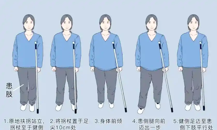 手杖使用技巧包括握持位置、步行與上下樓梯技巧。注意:在圖中,患側(cè)腿以藍(lán)色進(jìn)行標(biāo)記,而手杖則被放置在使用者的健側(cè)。手柄高度:當(dāng)身體保持直立,雙手自然垂在身體兩側(cè)時(shí),從手部橫紋處量起到地面的垂直距離。手杖的支點(diǎn)應(yīng)擺放在健側(cè)腳邊約15厘米處,這是手杖使用的基礎(chǔ)姿勢(shì)。在平地行走時(shí),建議初學(xué)者遵循三步走的順序:首先移動(dòng)手杖,接著邁出患肢,最后走健肢。隨著對(duì)手杖使用的熟悉,可以逐漸過(guò)渡到兩步走:手杖與患肢同步前進(jìn),再邁出健肢。對(duì)于上下樓梯,則需分別注意:上樓時(shí),手杖先行,緊接著健肢踏上樓梯,最后邁出患肢;下樓時(shí),同樣遵循手杖先行的原則,但順序相反,即患肢先下,再邁健肢。