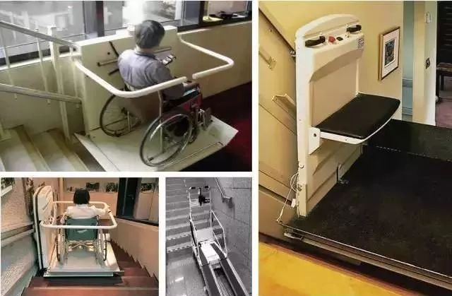 公共設(shè)施的入口大多數(shù)都設(shè)有殘疾人專用下樓梯的車,樓梯間也設(shè)有殘疾人專用的輪椅升降機(jī)