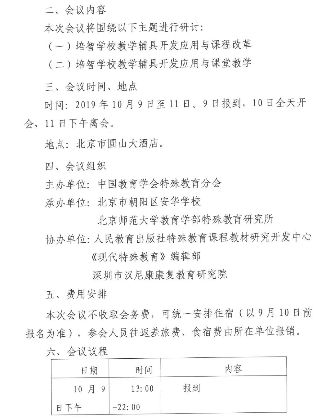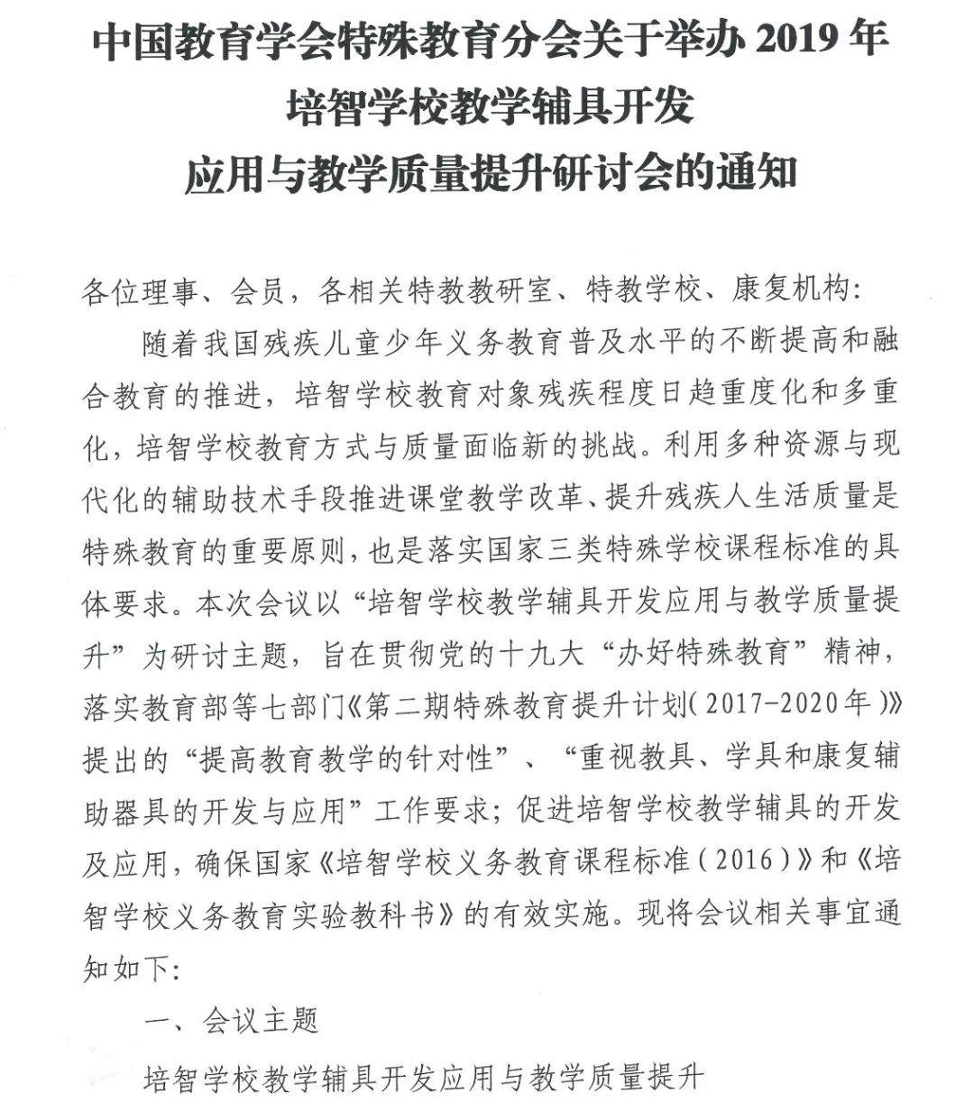 以下為由中國教育學(xué)會特殊教育分會舉辦的2019年培智學(xué)校教學(xué)輔具開發(fā)應(yīng)用與教學(xué)質(zhì)量提升研討會的通知: