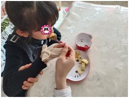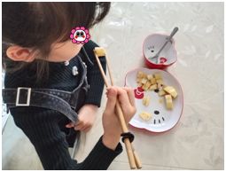(2)進(jìn)食:進(jìn)食固體或半固體食物時(shí),家長輔助下將食物盛入合適的碗里放在桌上,對于抓握較差的腦癱兒童,可以用繃帶固定手抓握勺子,家長一手輔助腦癱兒童前臂旋前、旋后,一手環(huán)轉(zhuǎn)腕關(guān)節(jié)將食物舀起送入口中(如圖1-3、1-4),反復(fù)練習(xí),提高其進(jìn)食能力。對于能力稍好的腦癱兒童,可以選取簡單改裝的筷子,如兩根筷子頂部用橡皮筋各纏繞兩圈固定的方式夾取食物進(jìn)食(如圖1-5、1-6)。