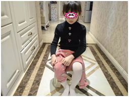 (5)穿褲子:兒童坐在凳子上,雙手抓住一側(cè)小腿使其交叉放在另一側(cè)大腿上(或一側(cè)下肢屈曲),把一側(cè)褲腿穿到腳踝以上或者膝蓋以上,交叉腿放下,另一側(cè)同上。穿好后站起,如果獨(dú)站不穩(wěn)的兒童可單手扶物,用一只手將褲子拉起至腰部(如圖2-11、2-12、2-13)。對不能獨(dú)坐凳子的腦癱兒童可以在床上進(jìn)行。