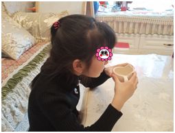 (1)飲水:飲水活動(dòng)時(shí),家長輔助從溫水壺里向水杯倒水,腦癱兒童可雙手抓握水杯把手(或雙手半握拳捧住杯體),雙肘關(guān)節(jié)屈曲至嘴邊將水送入口中吞咽。對于雙手抓握功能較差的腦癱兒童,可以使用吸管飲水(如圖1-1、1-2)。