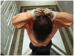 (3)梳頭訓(xùn)練:腦癱兒童在前方有鏡子的地方坐下,如果抓握困難,可以選擇加粗梳子把柄,家長演示梳頭發(fā)動(dòng)作使腦癱兒童模仿,或者輔助下讓腦癱兒童上肢舉過頭頂做來回環(huán)轉(zhuǎn)動(dòng)作梳理頭發(fā)(如圖3-5)。