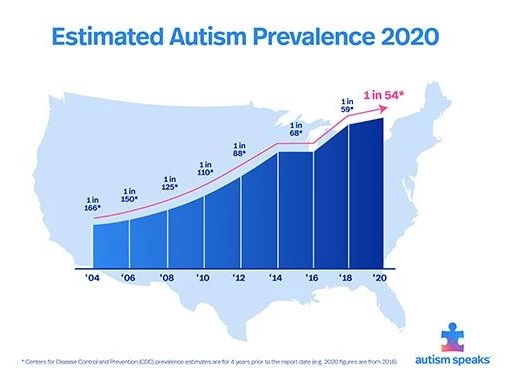 美國疾病預(yù)防控制中心(CDC)日前發(fā)布的數(shù)據(jù)顯示:在美國,每54個兒童中就有1名患有自閉癥(1:54),自閉癥患病率比2016年提高了近10%。