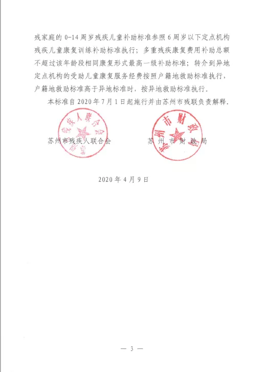 日前,蘇州市殘疾人聯(lián)合會、蘇州市財政局聯(lián)合下發(fā)《關(guān)于調(diào)整殘疾兒童基本康復(fù)服務(wù)項目補(bǔ)助標(biāo)準(zhǔn)的通知》。根據(jù)該通知,從2020年7月1日起,蘇州市對在定點機(jī)構(gòu)康復(fù)訓(xùn)練的殘疾兒童基本醫(yī)療保險結(jié)算以外的自付部分費(fèi)用補(bǔ)助標(biāo)準(zhǔn)進(jìn)行調(diào)整,殘疾兒童基本康復(fù)項目補(bǔ)助標(biāo)準(zhǔn)再提高,補(bǔ)助年齡也進(jìn)一步擴(kuò)大至18歲。