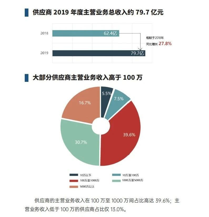 供應(yīng)商2019年度主營(yíng)業(yè)收入為79.7億元,較2018年同比增長(zhǎng)27.8%;總納稅額共計(jì)3.1億元,較2018年同比增長(zhǎng)24.2%。服務(wù)機(jī)構(gòu)營(yíng)業(yè)收入共計(jì)1.9億元,較2018年同比增長(zhǎng)23.0%;總納稅額共計(jì)0.12億元,較2018年同比增長(zhǎng)5.1%。