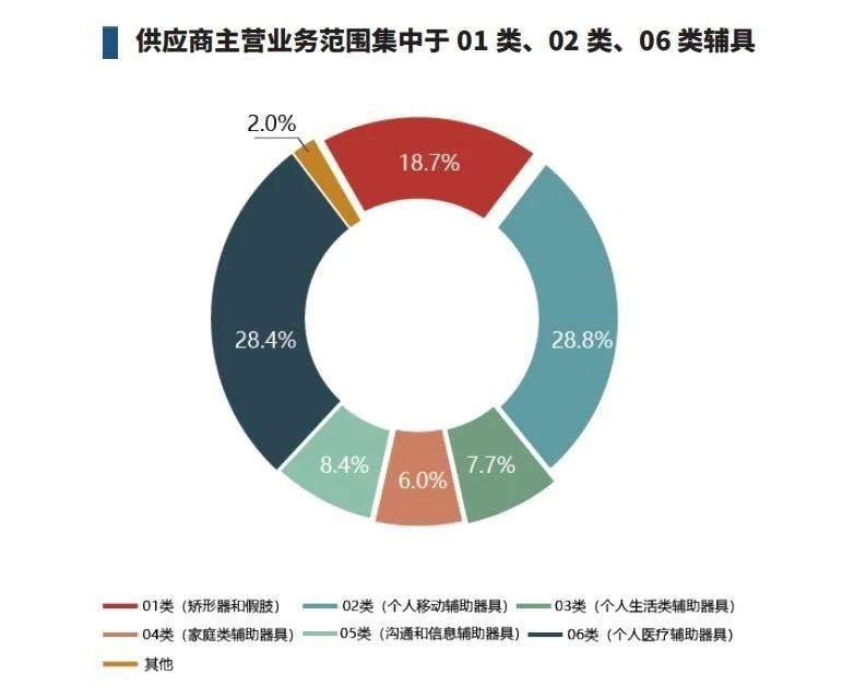 供應(yīng)商主營(yíng)業(yè)務(wù)絕大部分集中在01-06類(lèi)輔具,其中02類(lèi)(個(gè)人移動(dòng)輔助器具)和06類(lèi)(個(gè)人醫(yī)療輔助器具)占比相對(duì)較高。結(jié)合供應(yīng)商經(jīng)營(yíng)情況可知,供應(yīng)商在02類(lèi)輔具和06類(lèi)輔具上的產(chǎn)銷(xiāo)額和產(chǎn)銷(xiāo)量也較高。